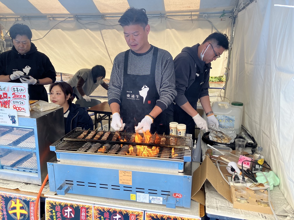 東通村の出店ブースでは、特産品である東通牛の牛串やホタテ焼きの販売のお手伝いをし、多くの方にお越しいただきました。また、一般社団法人東通東風塾(ひがしどおりやませじゅく)も出店し、「祈水(きすい)」をはじめとした特産品の日本酒を販売し、こちらも大好評でした。