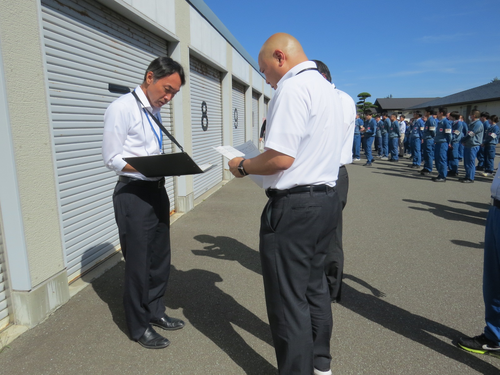 今回は事務所の給湯室から火災が発生したという想定で、事務所から駐車場への避難・誘導、通報連絡訓練、初期消火訓練などを行いました。