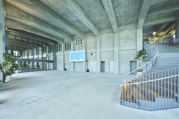 nooqu OFFICE 1階にある「屋内広場」は、植物やイスが配置され、誰でも気軽にくつろげる空間です。大きなモニターも備えていて、映像を使ったイベントにも活用できます。