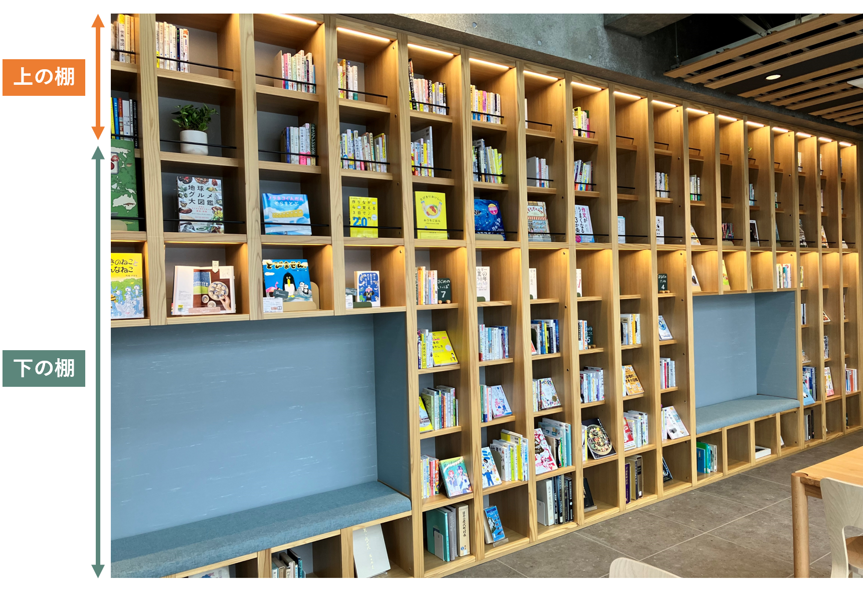 下の棚(手の届く範囲)と上の棚(上段2段)を各テーマ10冊程度の入替となります。