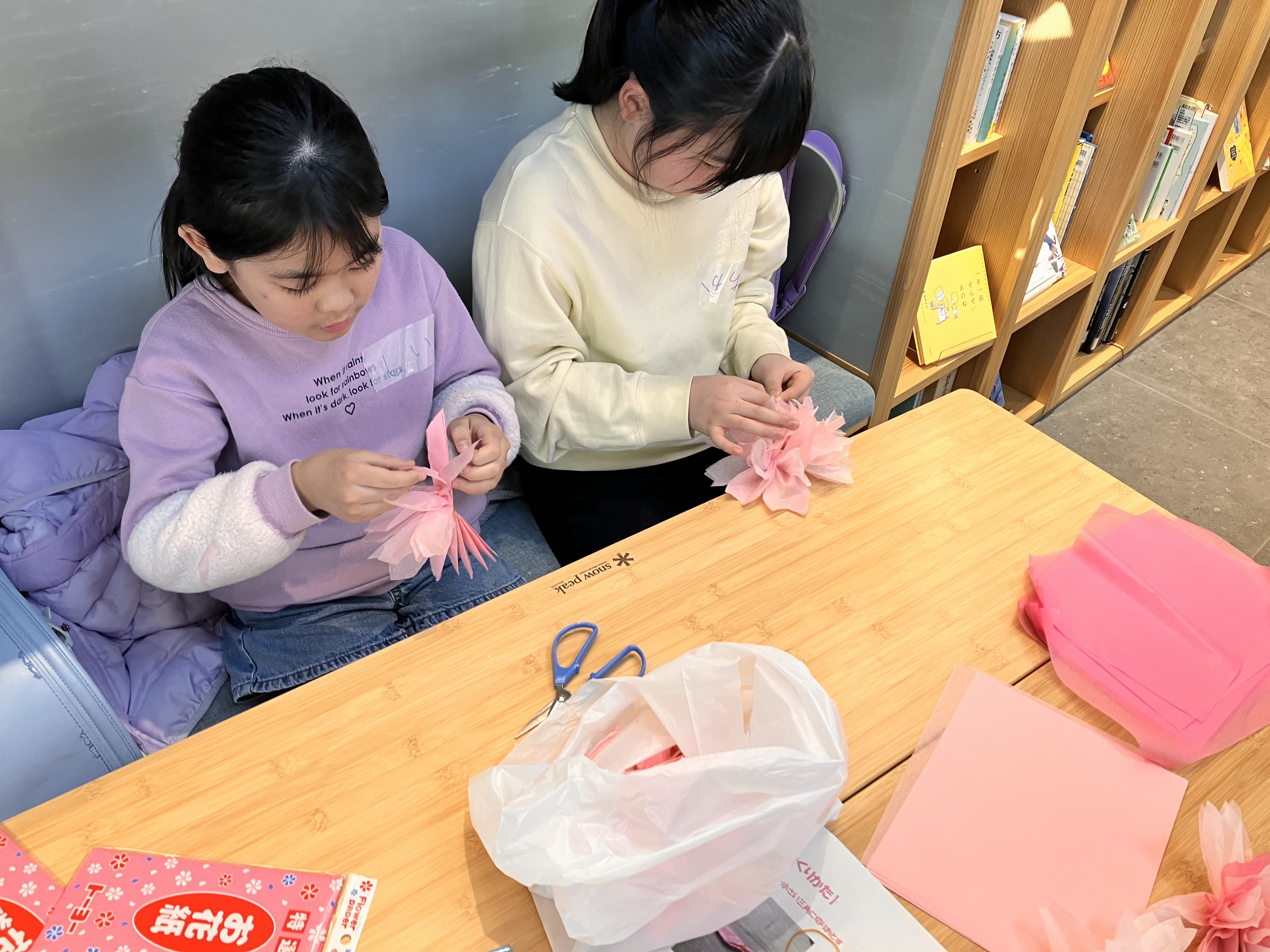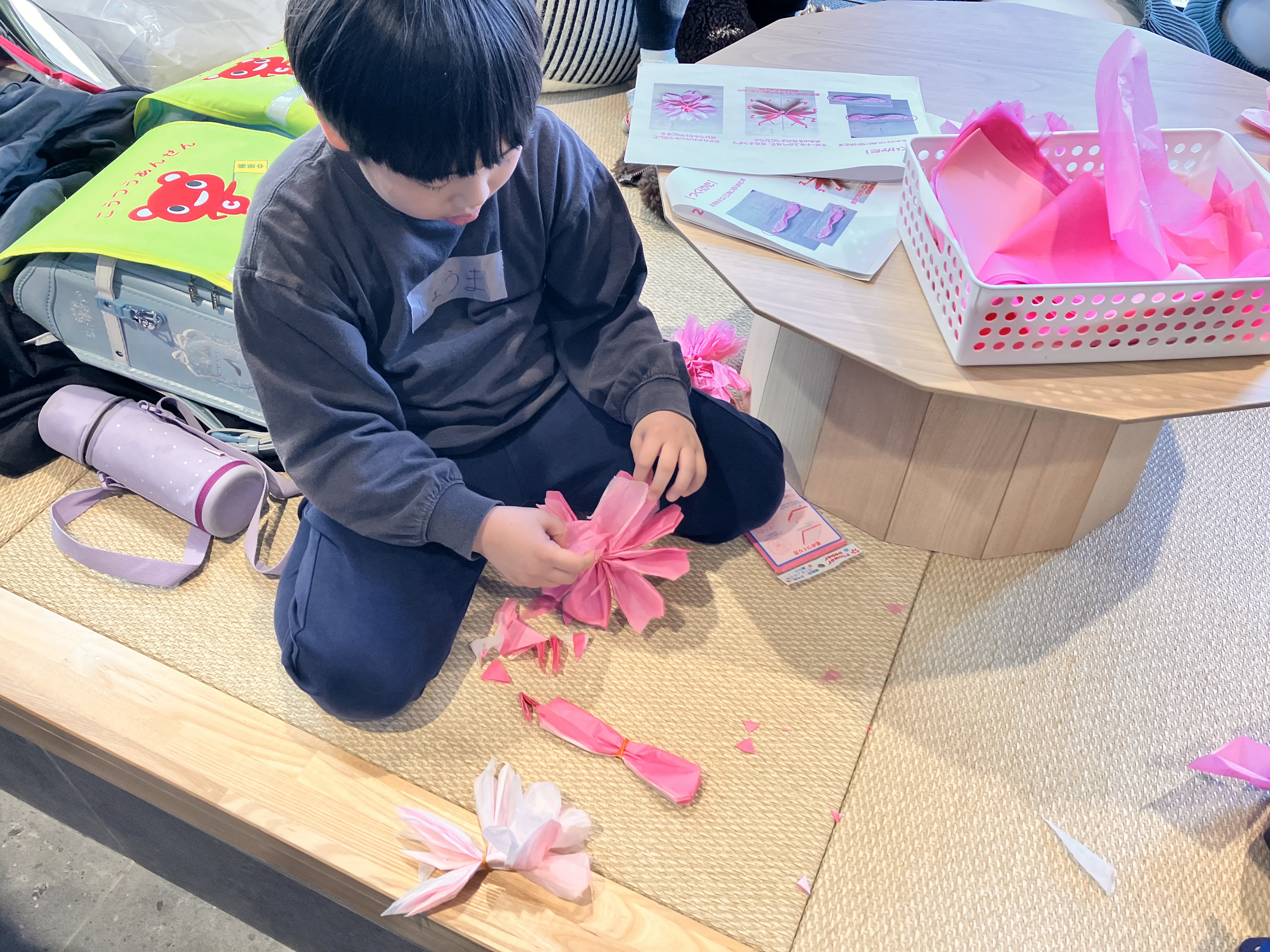 宿題タイムが終わると、机にはさくらの花を作る材料が用意されました。