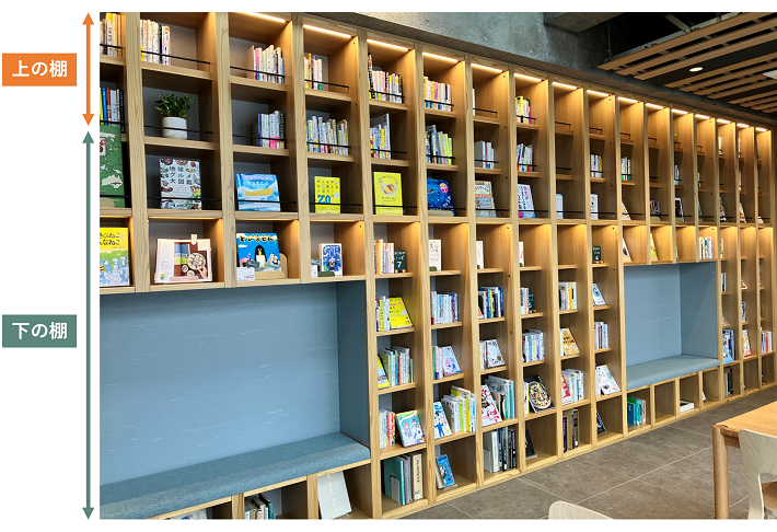 下の棚(手の届く範囲)と上の棚(上段2段)を各テーマ10冊程度の入替となります。