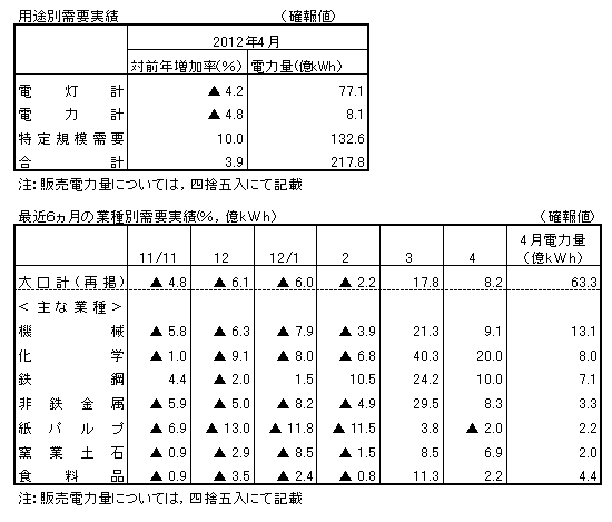 東京電力の4月の販売電力量は、昨年の東日本大震災の影響からの反動増などにより、産業用の大口電力がプラスの伸びとなったことなどから、前年同月比 3.9%増と2ヶ月連続で前年実績を上回りました。