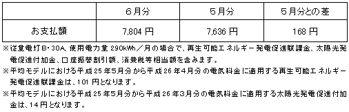 ○6月分の1月あたりの電気料金は、5月分に比べ168円の増となります。