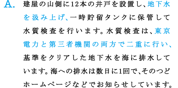 A.建屋の山側に12本の井戸を設置し、地下水を汲み上げ、一時貯留タンクに保管して水質検査を行います。水質検査は、東京電力と第三者機関の両方で二重に行い、基準をクリアした地下水を海に排水しています。海への排水は数日に1回で、そのつどホームページなどでお知らせしています。