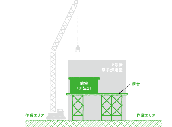 A.燃料取り出し作業の支障となる周辺の建物の解体や、大型重機が作業するための場所の整備が2016年11月に完了しました。その後は、原子炉建屋5階(オペレーティングフロア)へアクセスするための構台と呼ばれる大きな作業台の設置を進めています。※注2:前室とは?