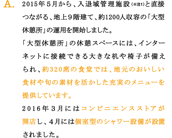 A.2015年5月から、入退域管理施設(※注1)と直接つながる、地上9階建て、約1200人収容の「大型休憩所」の運用を開始しました。