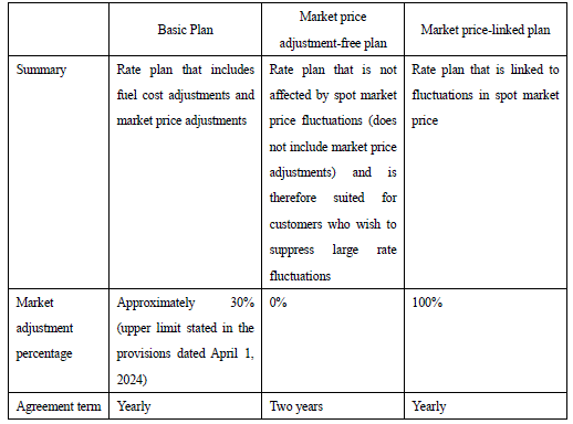 - A basic plan that includes fuel cost adjustments and market price adjustments, a market price adjustment-free plan that includes only fuel cost adjustments, and a market price-linked plan that includes only market price adjustments will be newly offered (to be added to the standard options in April 2024)