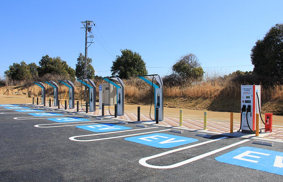 Rapid charging station at Shin-Tomei Expressway Hamamatsu Service Area (downward), capable of charging eight EVs simultaneously