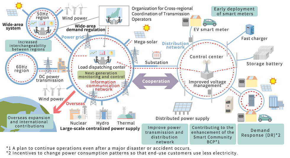 Through our next-generation energy supply system that combines power and communications infrastructures, we hope to achieve a balance between the supply and demand of electricity, effectively use renewable energy, reduce transmission losses, and provide a stable supply of power through the adoption of control systems that utilize new communications technology.