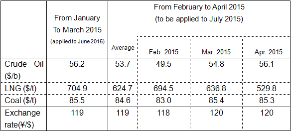 In response to today's publication of the fuel prices for February to April 2015 (trade statistics prices of crude oil, LNG, and coal), the fuel cost adjustment unit prices in the electricity rates for July 2015 have been fixed as follows: