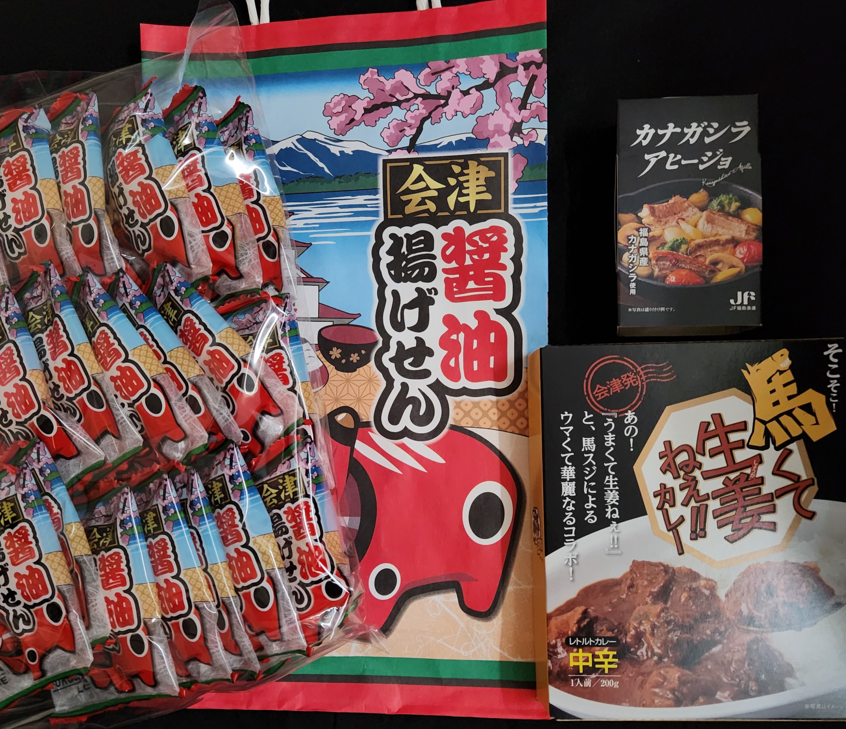 セット内容 | 会津醤油揚げせん(揚げせんべい) 1袋 カナガシラアヒージョ(アヒージョ) 1パック そこそこ馬くて生姜ねぇ!!カレー(馬肉カレー) 1人前 200g |