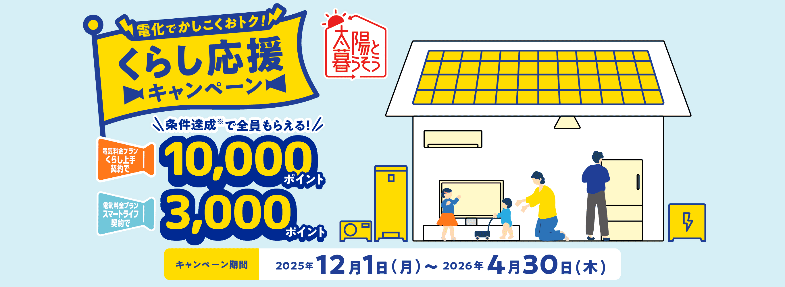 電化でかしこくおトク!くらし応援キャンペーン 条件達成※で全員もらえる! 電気料金プランくらし上手契約で10,000ポイント 電気料金プランスマートライフ契約で3,000ポイント キャンペーン期間 2025年12月1日(月)〜2026年4月30日(木) 太陽と暮らそう