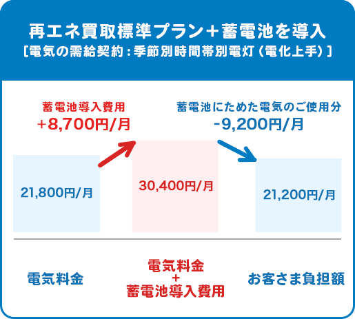 ●季節別時間帯別電灯(電化上手)および再エネおあずかりプラン[季節別時間帯別電灯]は契約容量8kVAおよび余剰電力量250kWh /月のモデルケースを前提に算定しています。●季節別時間帯別電灯(電化上手)の使用電力量は600kWh/月(夏季ピーク時間:8kWh /月、その他季ピーク時間:30kWh /月、オフピーク時間:216kWh /月、夜間時間:346kWh /月)のモデルケースを前提に算定しています。●季節別時間帯別電灯(電化上手)の料金は、当社ホームページに記載の選択約款「季節別時間帯別電灯」の2025年4月1日以降に適用される料金に基づき算定しています。なお、燃料費調整額および再生可能エネルギー発電促進賦課金は含みません。●再エネおあずかりプラン[季節別時間帯別電灯]の使用電力量は600kWh/月(夏季昼時間:8kWh/月、その他季昼時間:30kWh/月、朝時間および晩時間:216kWh /月、夜時間:346kWh /月)のモデルケースを前提に算定しています。●再エネおあずかりプラン[季節別時間帯別電灯]の料金は、当社ホームページに記載の契約種別が「再エネおあずかりプラン[季節別時間帯別電灯]」の2025年4月1日以降に適用される料金に基づき算定しています。なお、燃料費調整額および再生可能エネルギー発電促進賦課金は含みません。●再エネおあずかりプランのおあずかりサービス料金には消費税等相当額を含みます。●再エネ買取標準プランの買取金額は買取単価8.5円/kWh(消費税等相当額を含む)で算定しています。●季節別時間帯別電灯(電化上手)の電気料金に対する蓄電池導入による削減額は、余剰電力量250kWh/月に対し、容量が8.2kWhの蓄電池(250kWh/月を蓄電)を導入した場合で算定しております。なお、蓄電は全て余剰電力量でまかなうものとし、夏季ピーク時間(8kWh/月)、その他季ピーク時間(30kWh/月)およびオフピーク時間(212kWh/月)に充当されるものといたします。●蓄電池導入費用は、「2018年3月22日実施 資源エネルギー庁第4回 再生可能エネルギー大量導入・次世代電力ネットワーク小委員会 資料3」より引用した、蓄電池価格(19万円/kWh)および蓄電池寿命(15年)による算定につき、実際に導入される場合とは異なる場合があります。●電気料金、お客さま負担額、買取料金、蓄電池導入費用、おあずかりサービス料金、蓄電池導入による削減額は100円未満を四捨五入して表示しています。