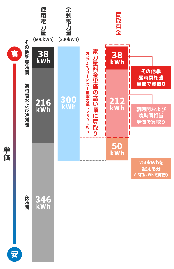 • 余剰電力については、毎月250kWhを上限に、お客さまの使用電力量のうち、高い単価の使用電力量から電力量料金単価相当で買取りさせていただきます。