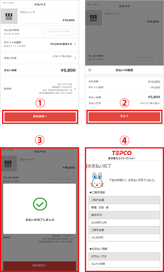 - ①メルペイアプリをダウンロード済みの場合は自動的にアプリが起動されます。メルペイアカウントでのログイン完了後、ご請求情報をご確認のうえ、「確認画面へ」をタップしてください。