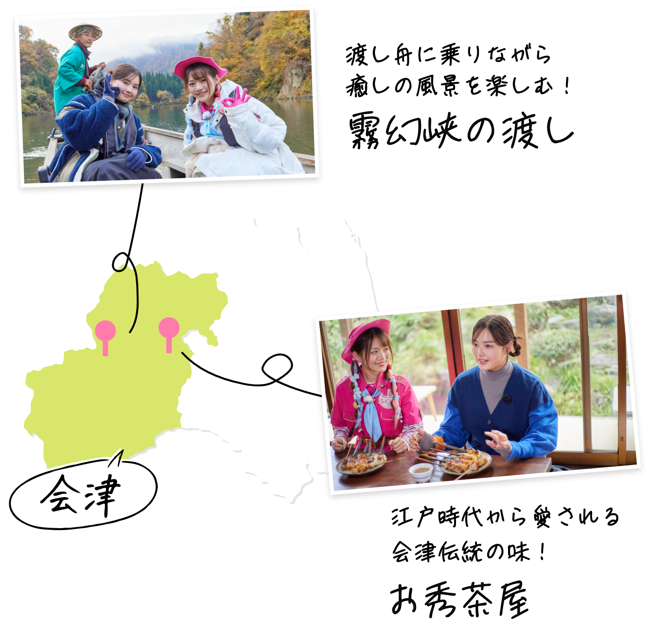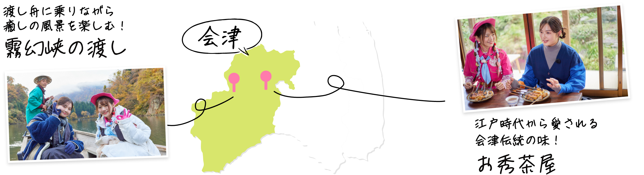 会津地方の旅もいよいよ最終回。やってきたのは、金山町と三島町の境を流れる只見川の渓谷にある「霧幻峡(むげんきょう)の渡し」です!静かな水音や自然の香りに包まれ、昔の日本の里山や田舎の懐かしい風景を強く連想させます。「お秀茶屋(おひでちゃや)」さんは江戸時代(延宝年間・約360年前)創業の老舗のお茶屋で、名物は囲炉裏の炭火で一本一本丁寧に焼き上げる会津の郷土料理「味噌田楽」です。秘伝の甘辛味噌を塗った香ばしい味わいが大人気!