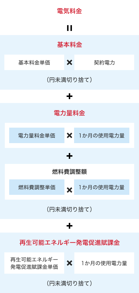 月々の電気料金は、契約の大きさで決まる基本料金と、使用電力量に応じて計算する電力量料金に、再生可能エネルギー発電促進賦課金を加えたものです。なお、電力量料金は燃料価格の変動に応じて、燃料費調整額を加算します。なお、燃料費調整額はマイナスとなる場合もあります。