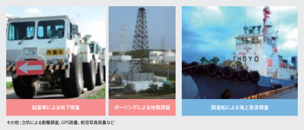 地質調査は、起震車による地下探査、ボーリングによる地質調査、調査船による海上音波探査、立坑による断層調査、GPS測量、航空写真測量など、さまざまな調査方法で実施し、国の新しい耐震設計の指針に基づき、発電所周辺の活断層を評価しました。
