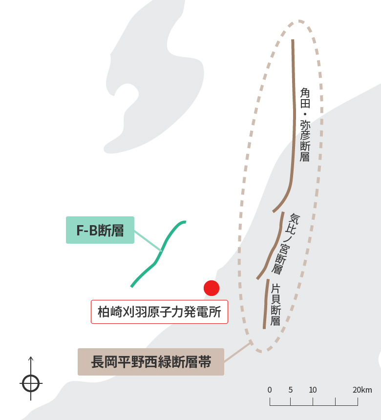それらの活断層のうち、発電所に与える影響の大きい活断層として、海域の「F-B断層」、陸域の「長岡平野西縁断層帯」による地震を選定し、基準地震動を策定しました。