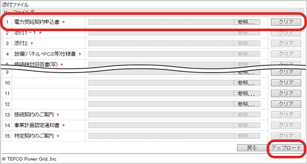 ①「1電力受給契約申込書」「13接続契約のご案内」「15特定契約のご案内」につきましては、当社がアップロードしますので、工事店さまによるアップロードの必要はございません。