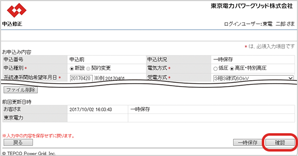 高圧・特別高圧のお申込みにおいて、申込登録画面に入力いただいた内容を反映した申込書がシステムから自動作成されます。