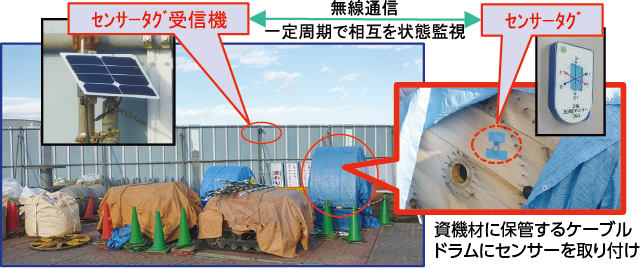 - 盗難防止用に加速度センサーを取り付けます。従来見廻りで監視していたが常時監視できるため、動いた時点で素早く把握できるようになり見廻り回数が減ります。
