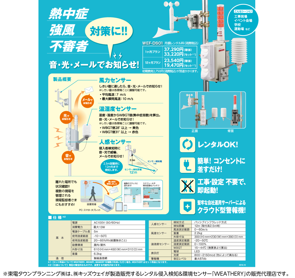 温度・湿度・風速センサーを装備し、閾値に達すると激しく点滅するLED灯と日本語で警報を発します。