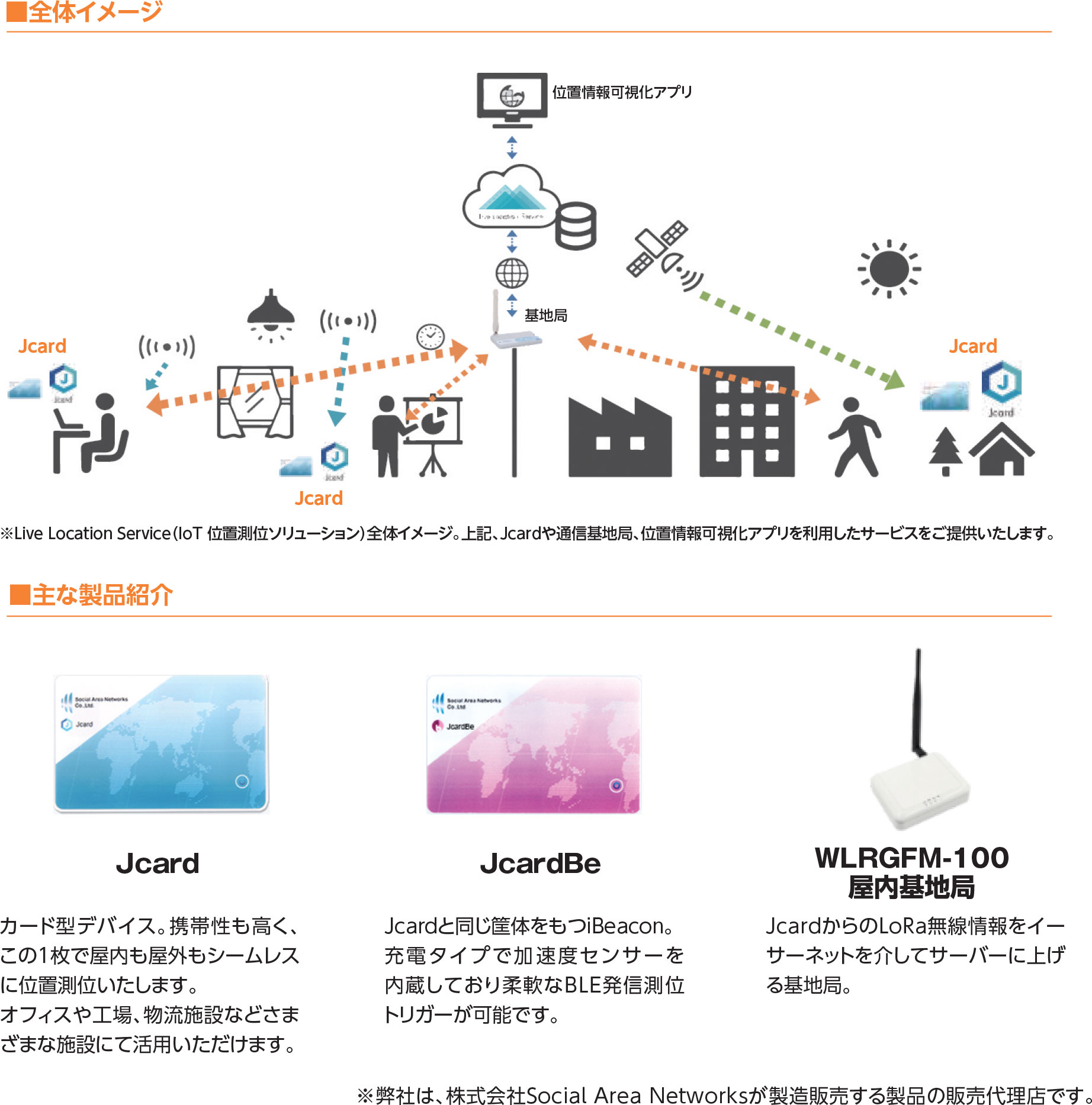 厚さ4mmのカード(Jcard)や同サイズのiBeaconなどを携帯・設置することによるリアルタイムな位置情報の把握、作業の滞在時間(タイムライン)の把握、