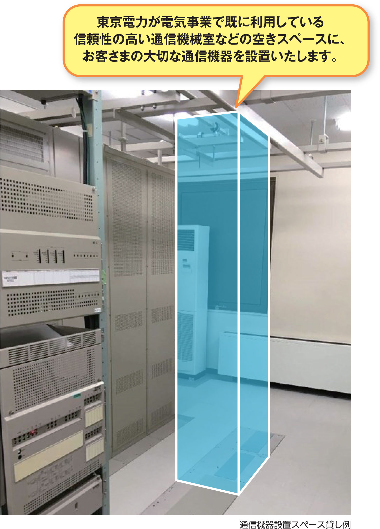 - 弊社は、電力の安定供給に必要な電力ネットワークを制御するため、多くの通信ネットワーク機器を保持しており、その設備を設置するための通信機器設置スペースを保有しております。