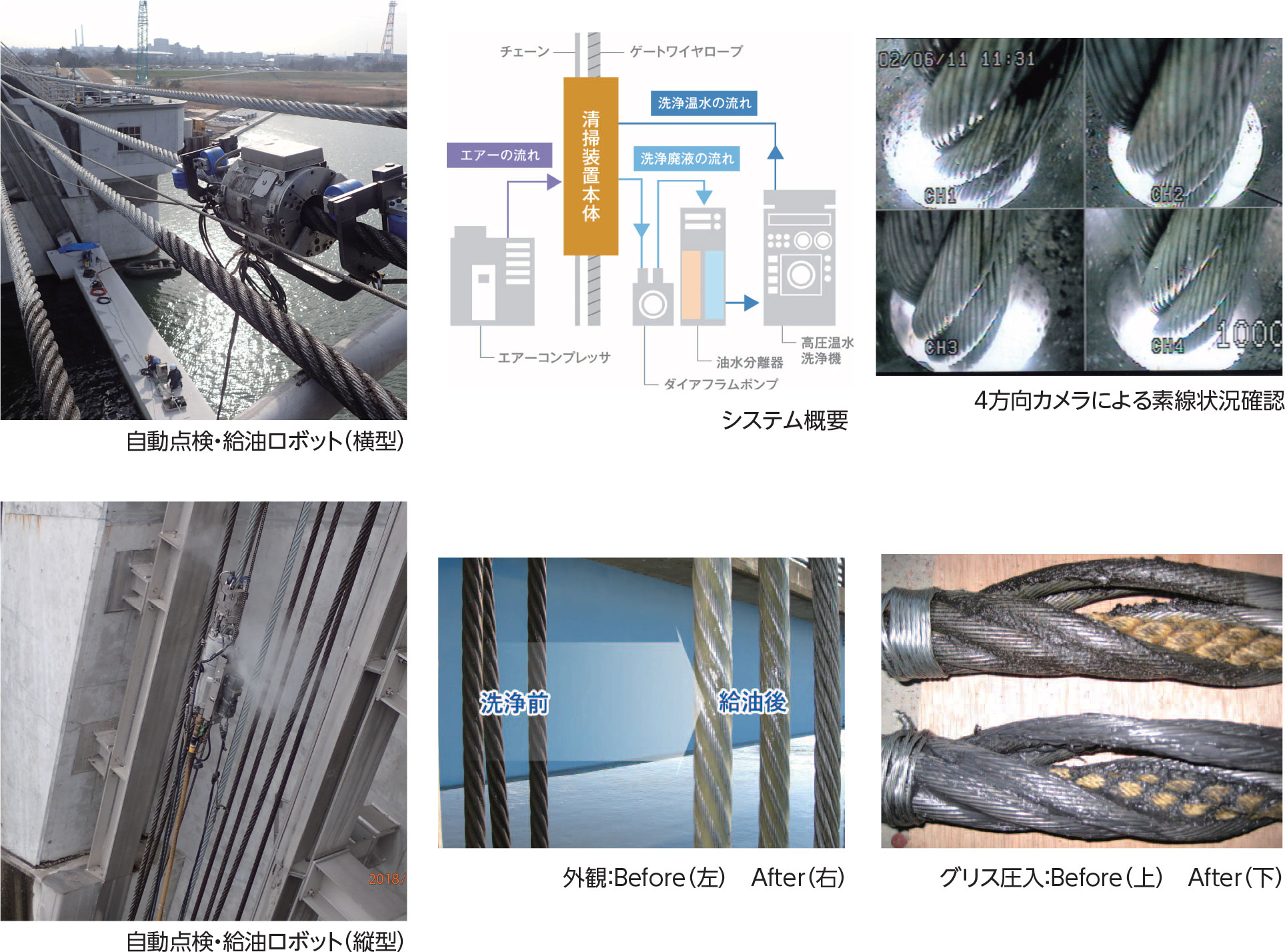 設備の安全性に大きくかかわるワイヤロープは、使用状況や環境により、その耐久性・寿命に大きく差が出ます。弊社では、古いグリスを完全に除去した上で劣化状態を診断し、給油する自動ロボットの活用により、質の高いメンテナンスを短納期・低コストでご提供いたします。