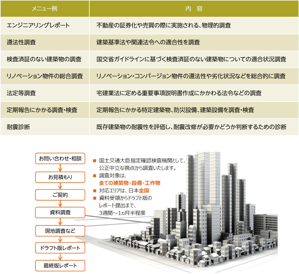 - 指定確認検査機関でなければ行えない、検査済証のない建築物の建築基準法への適合状況調査が可能です。