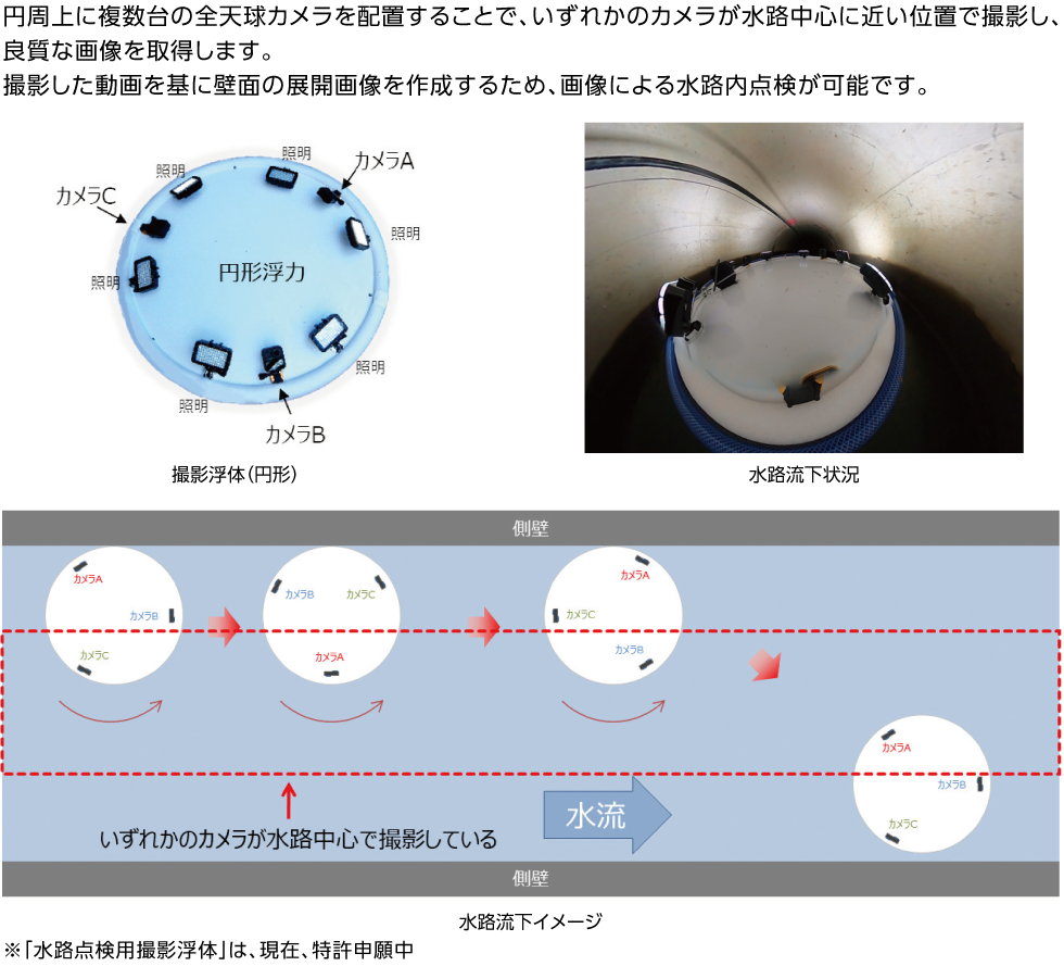 - 水路に浮体を流下させることで、通水中に無人・無動力で壁面を撮影することが可能です。