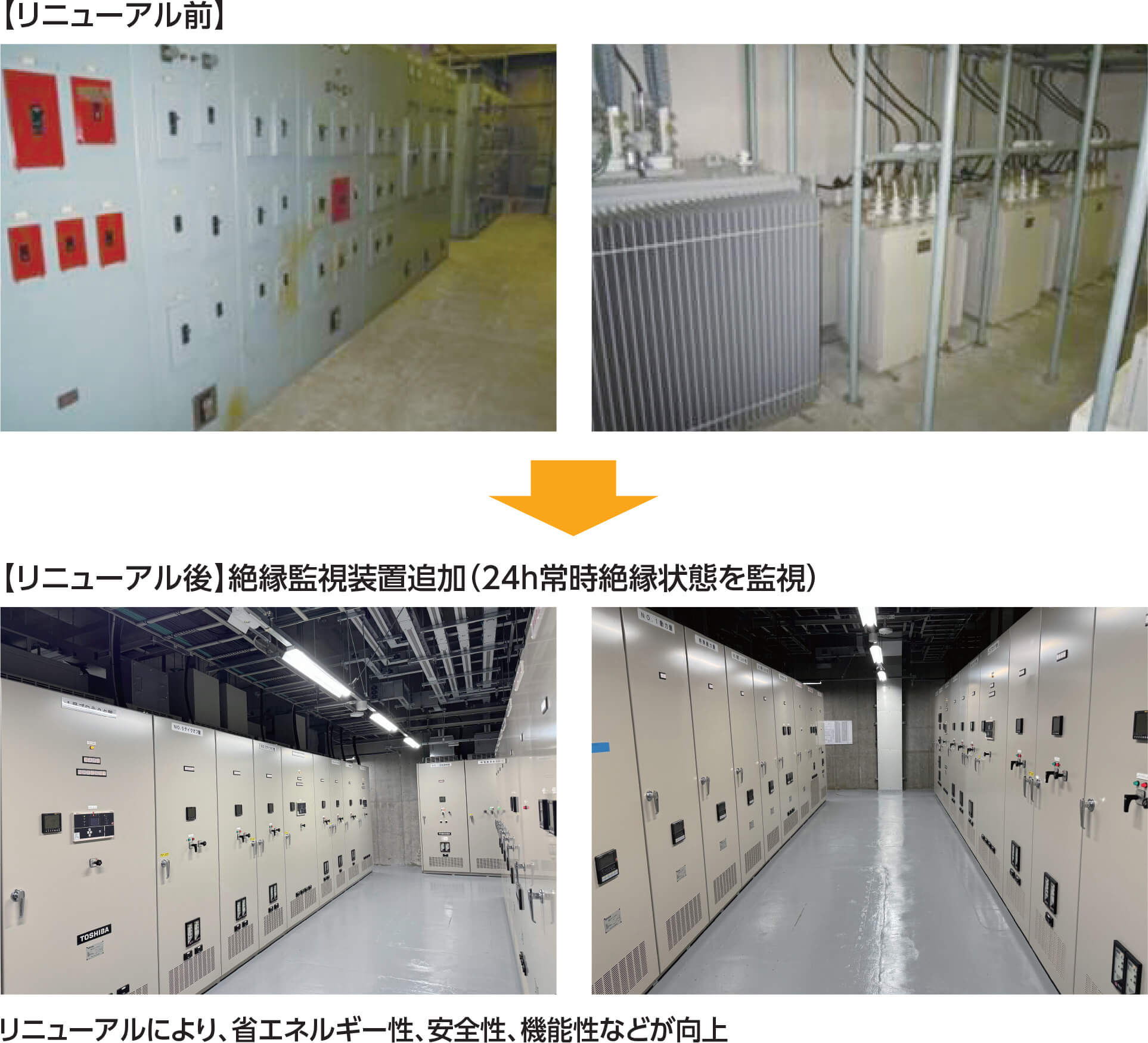 受変電設備の経年劣化の多くは、絶縁耐力の低下が原因であることから、弊社は経年劣化の状況確認として、設備診断を実施することをおすすめいたします。電源品質の低下が予想される場合は、計測器によるデータ収集と解析から対策をご提案いたします。また、機器の機能や安全性、信頼性を回復させると共に高効率機器の採用、保守性の向上やコンパクト化による空きスペースの有効活用も検討いたします。