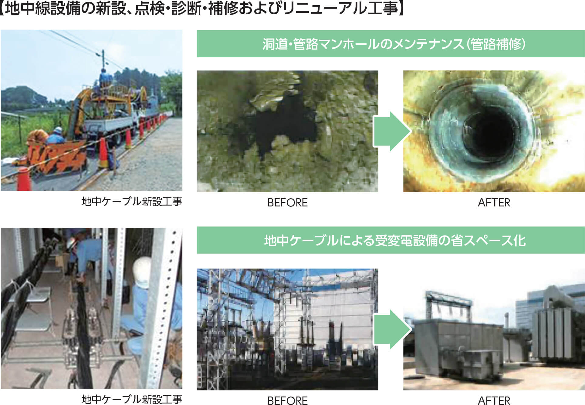 (高圧ケーブルから特別高圧ケーブル工事に管路工事も含めて対応いたします。また、非開削※での地中推進工法[アリトン工法]もご提供可能です。) - リニューアル工事をご提案いたします。