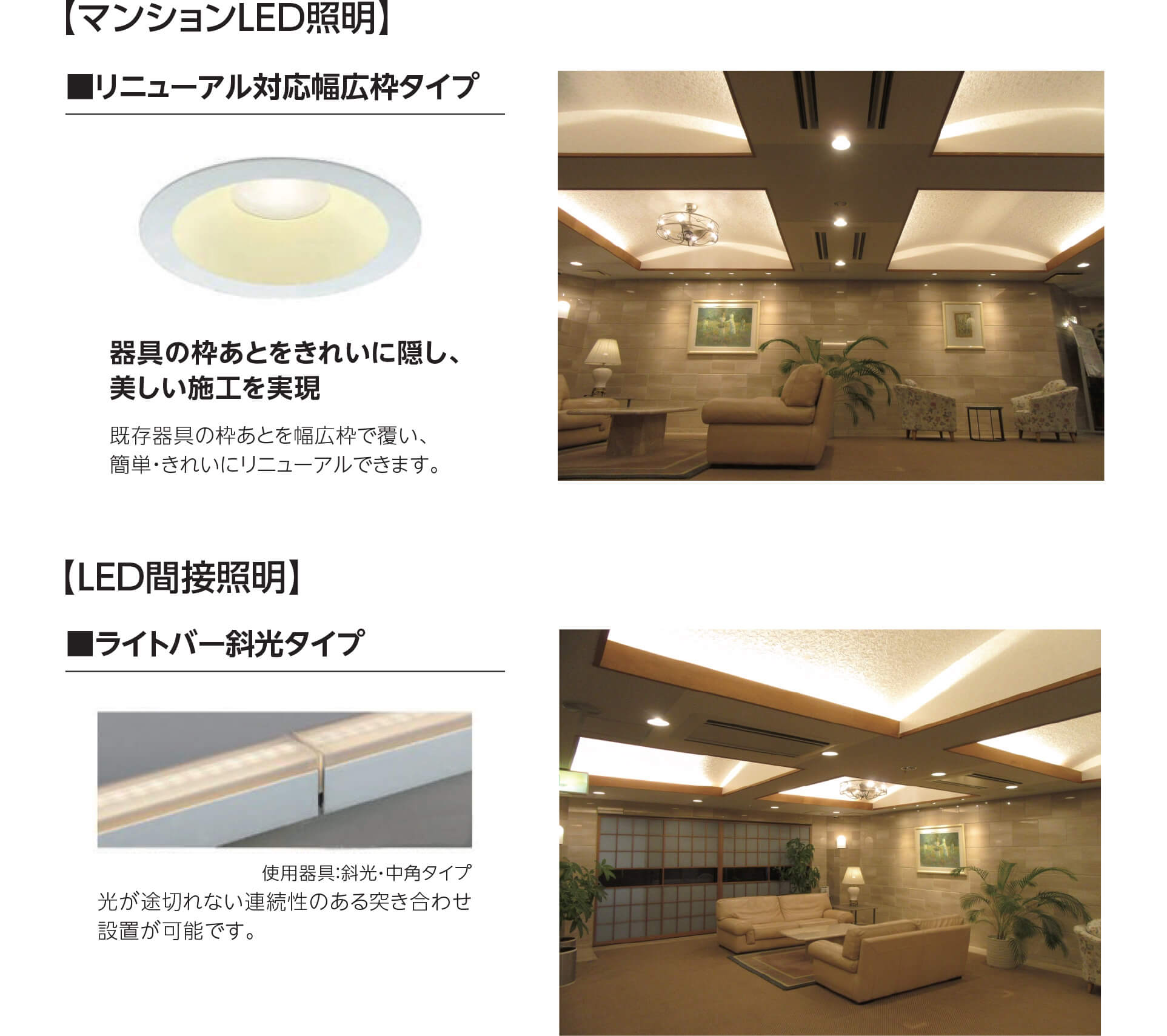- 既存の照明器具の開口に合わせたLED機器の選定をいただき、コストを抑えることができました。 マンション管理組合さま