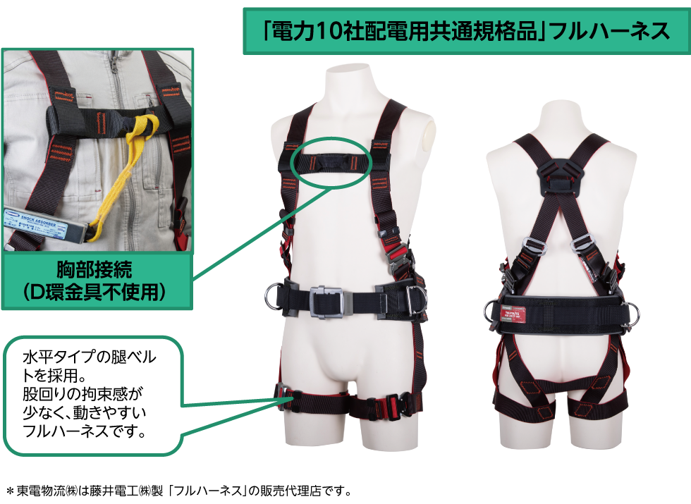 - 「電力10社配電用共通規格品」は、配電作業時の感電事故を抑制すべく生まれたノーリング型フルハーネスです。胸部および背部のランヤード接続部にD環金具を使用しておらず、専用の連結ベルトタイプのランヤードを組み合わせて使用することで、感電に対するリスクを低減しました。