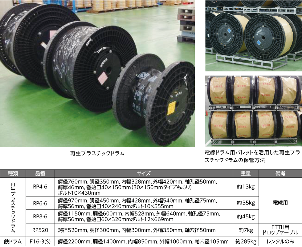 - 一部商品については、東京電力パワーグリッドの配電設備から撤去された電線被覆材や、絶縁カバーなどを再利用して製造しており、また、壊れたドラムも粉砕してドラムの廃材として再利用しています。