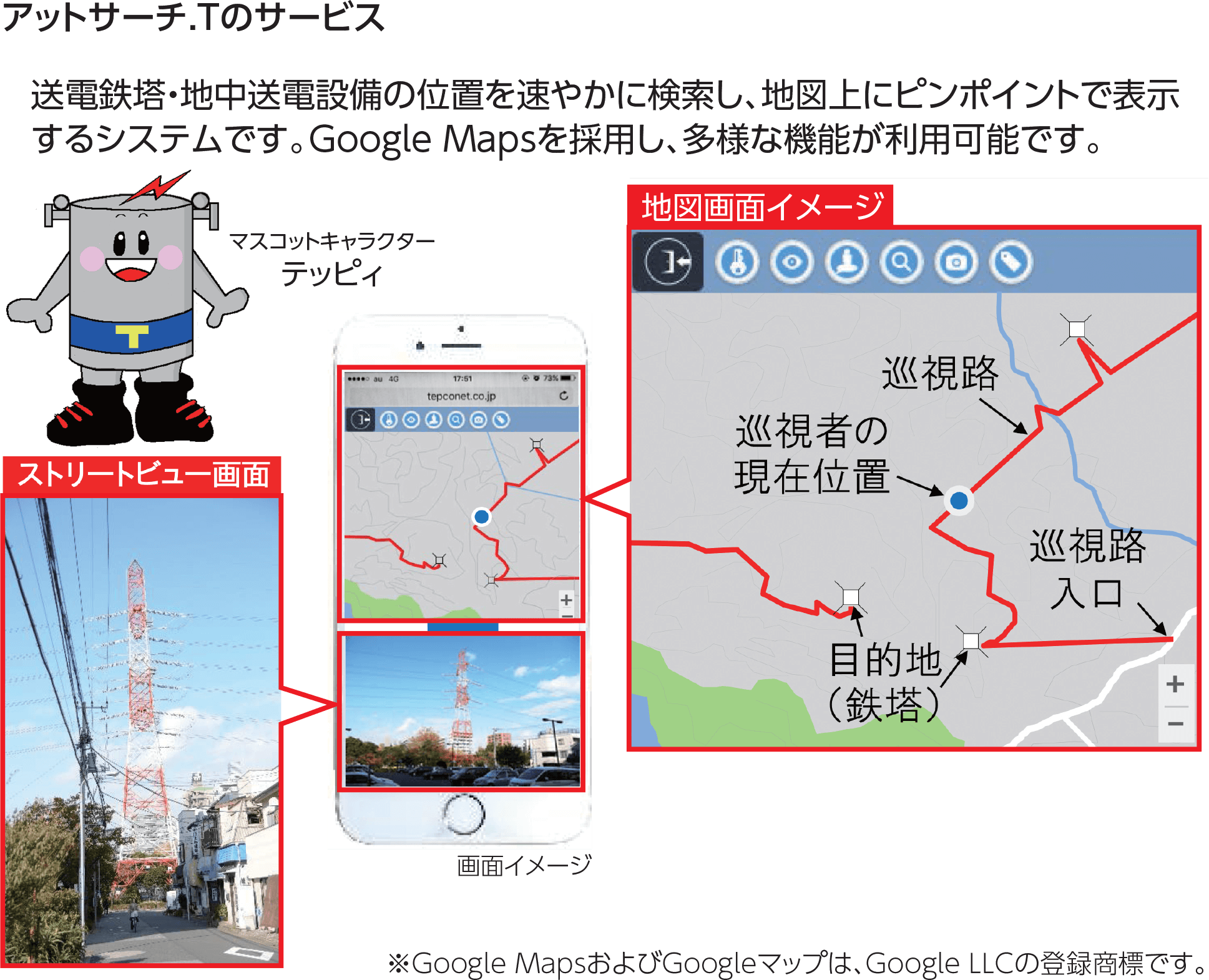 - 設備番号や住所から、送電鉄塔や地中送電設備の位置を特定し、ストリートビューや航空写真で、現地の状況が確認可能です。