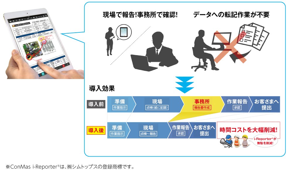 「ConMas i-Reporter®」は、チェックシートや報告書作成に必要な機能が網羅されており、カメラ撮影や数値の自動計算など、タブレット1台で業務が完結する入力支援ツールです。