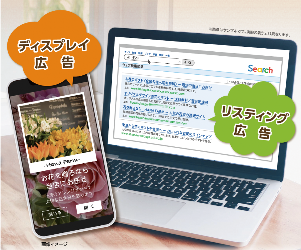 - 「リスティング広告」は、Yahoo!JAPANやGoogleの検索結果の目立つ場所に表示されます。検索キーワード連動型なので、商品の購入やサービスの利用を検討している方に効果的なPRが可能です。