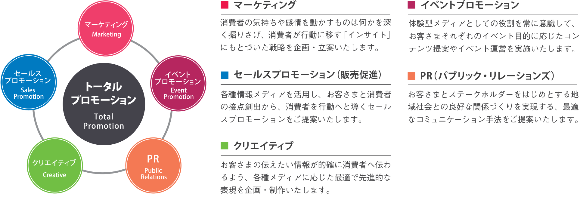 - ビジネスにおけるベストパートナーとして、常に真摯に向き合い、お客さまのニーズを満たす最適なセールスプロモーション(販売促進)をご提案いたします。
