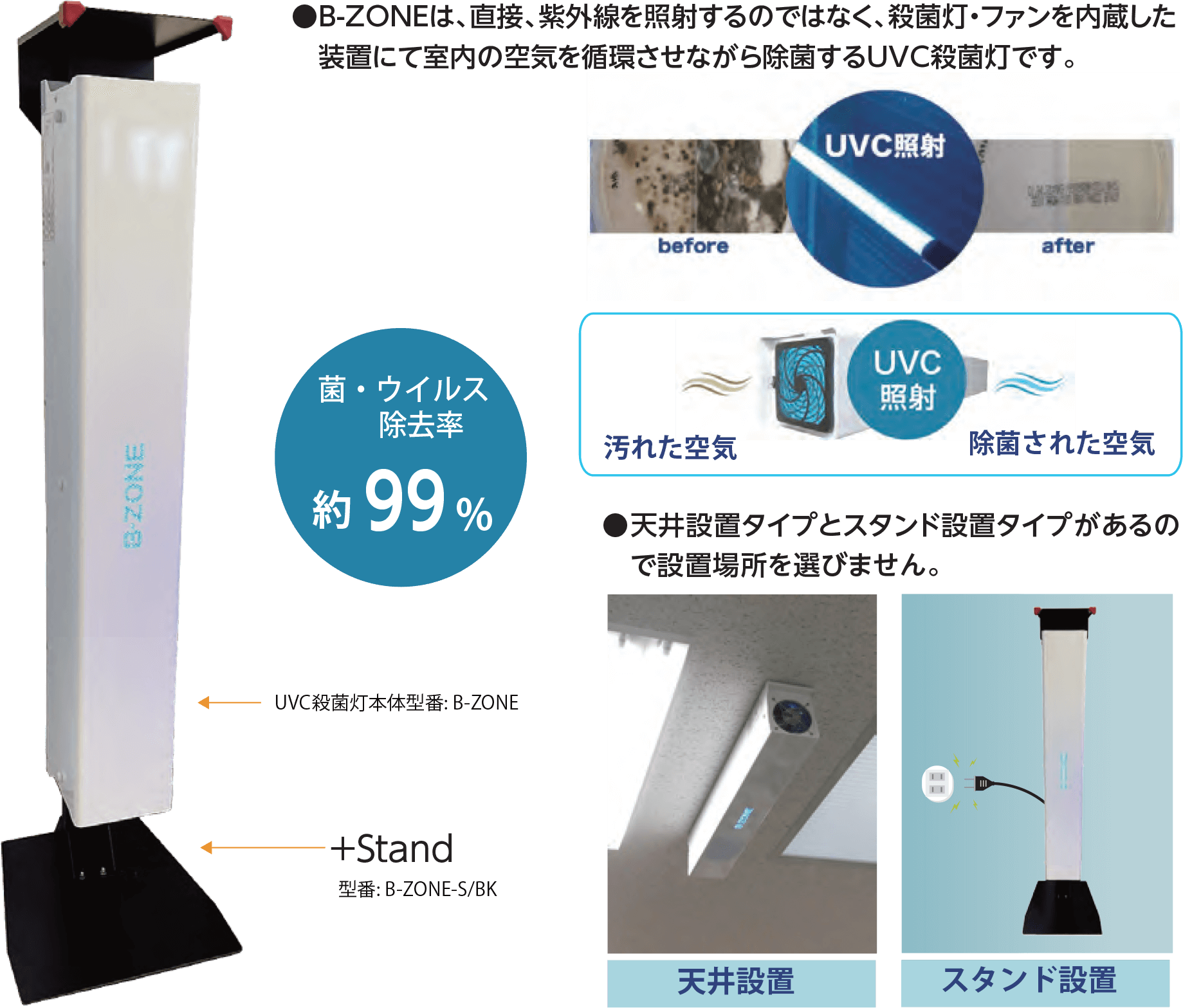 B-ZONEは、高性能照射ユニットにより同規格製品よりも短時間で効率よく室内の空気を除菌します。 - 空調との併用が可能