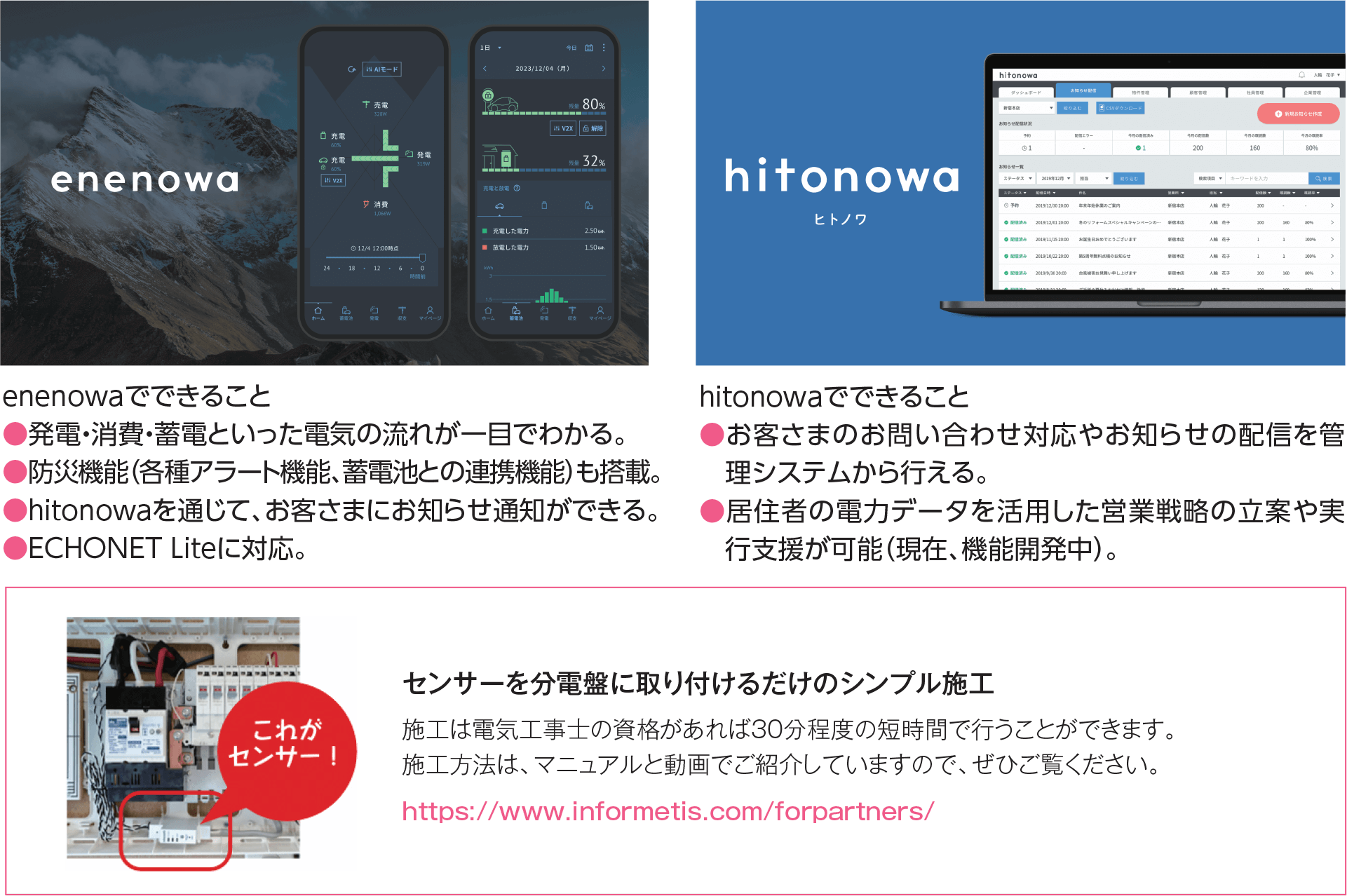 「enenowa」は、インフォメティス社製電力センサーを設置した家庭で利用可能なスマートフォンアプリです。太陽光発電や蓄電池の充放電、家電による電気の使用といった、家庭におけるエネルギーの流れをわかりやすく表示します。また、「家電のつけっぱなし」「電気の使い過ぎ」などの便利なお知らせ機能や、「気象警報」などの防災機能も搭載しています。これらにより、スマートで経済的なエネルギーの利用や安心・安全な暮らしを実現いたします。