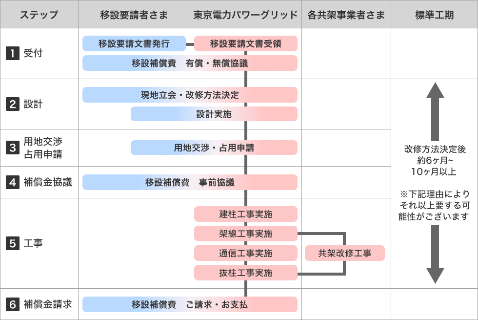 - 地中管路等地中設備の移設や再開発事業等による大規模な移設、他の工事お申込みが輻輳している場合、用地取得が難航する場合等については、改修方法決定後、撤去まで概ね10ヵ月以上要する場合がございます。