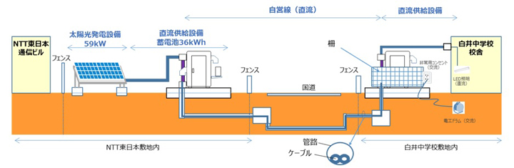NTTアノードエナジーは、東日本電信電話株式会社(NTT東日本)の遊休地を利用して太陽光発電設備と蓄電池を設置し、停電時には、千葉市が避難所に指定している白井中学校へ自営線による直流供給を行います。企業・自治体等による、敷地外の第三者施設への自営線を活用した直流供給は、国内初※の取り組みとなります。具体的には、以下の検証および検討を進めてまいります。※NTTアノードエナジー調べ