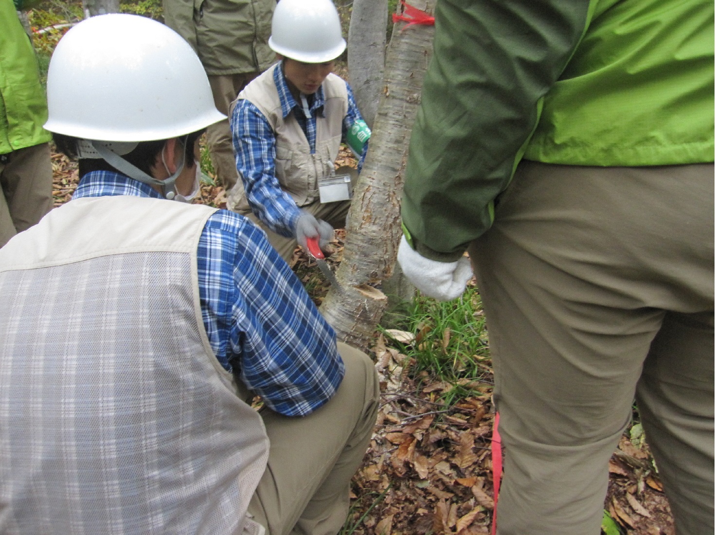 植林から20年近く経ち、健全な森に育てていくために成長の遅い木等の間伐が必要であること等の説明を講師から受けた後、早速、作業に取り組みました。
