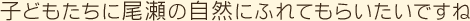 - 「でも六甲山のように新幹線の駅の真裏に、あたりまえのように自然があるっていうのもいいですよね。私も、自然保護活動発祥の地である尾瀬にたずさわっている人間として、簡単ではありませんけど、もっと門戸を広げられたら、そして子どもたちが初めてふれた大自然が尾瀬だったりしたらいいなって思います」