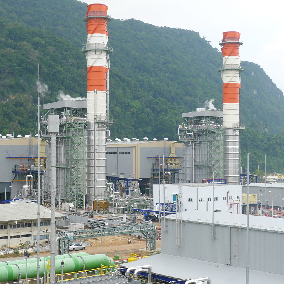 カノーム発電所(1~4号機) 手前の2つの建物・赤白の煙突が今回増設工事を行っている4号機(2軸構成)。左奥に小さく見える2つの赤白の煙突が奥から1号機、2号機で中央奥の建物が3号機。
