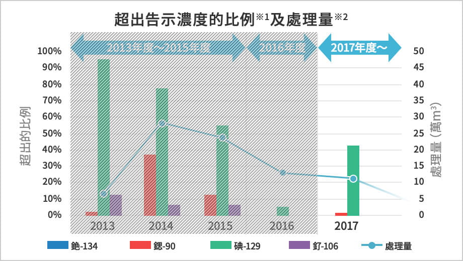 利用多核種去除設備的淨化能力進行了處理,與2013年〜2015年相比,各個核種超出告示濃度的發生比例減少了。